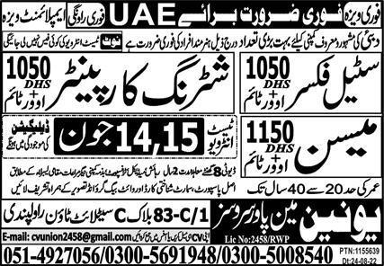 Vacant posts including steel fixer, mason and shuttering carpenter are announced in Union Manpower Services UAE, dubai UAE as per 13 June 2023 advertisement in daily Express Newspaper. Candidates with Middle etc. educational background will be preferred.