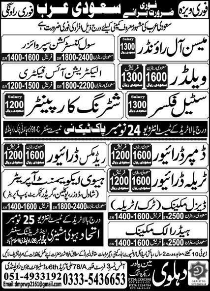 Dahlawi Manpower Recruiting jobs advertisement dated about 23 November 2022 in daily Express Newspaper invites application for the vacant post of welder, diesel mechanic, hydraulic mechanic, traila driver, steel fixer, electrician ice factory, shuttering carpenter, heavy equipment operator, dumper driver, civil construction supervisor and mason all rounder in Riyadh, riyadh Saudi Arabia. Educational qualifications required Intermediate, Matric and Middle etc.