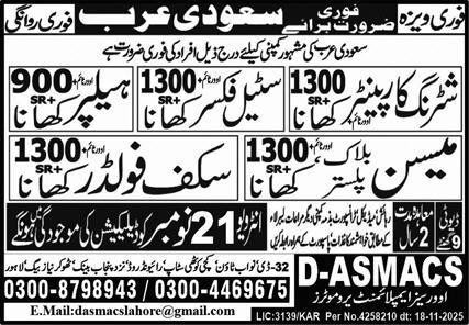 D ASMACS Overseas is looking for candidates for following posts as per job advertisement published in daily Express Newspaper of November 19, 2025 for location Jeddah, al khobar Saudi Arabia: