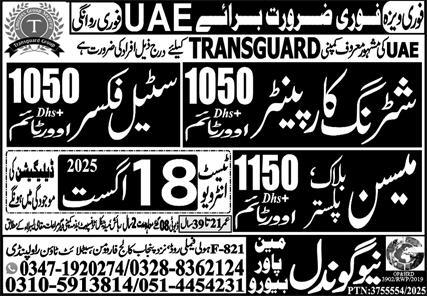 New Gondal Manpower Bureau invites applications for job positions advertised in daily Express dated 13 August 2025 for following vacancies in Abu Dhabi, sharjah UAE.