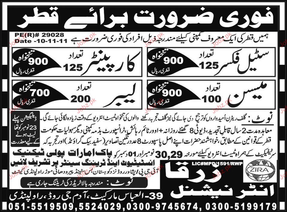 Steel Fixer, Carpenter, Mason and Labors Job Opportunity