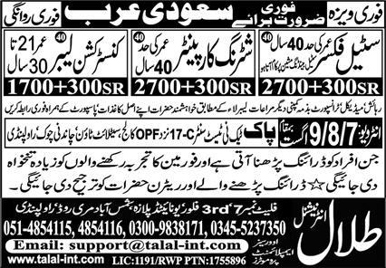 Talal International Overseas Employment Promoters is looking for candidates for following posts as per job advertisement published in daily Express Newspaper of August 4, 2023 for location Makkah, madina Saudi Arabia: