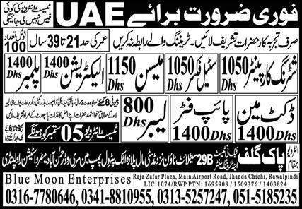 Vacant posts including steel fixer, mason, labor, pipe fitter, electrician, shuttering carpenter, plumber and docket man are announced in Blue Moon Enterprises Abu Dhabi, sharjah UAE as per 31 August 2023 advertisement in daily Express Newspaper. Preferred Education is Matric and Intermediate etc.