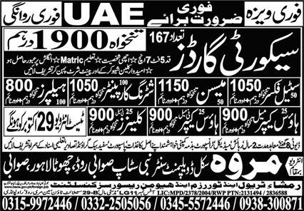 Vacant posts including security guard, cleaner, house keeper, mason, steel fixer, shuttering carpenter, female cleaner, female house keeper and helper are announced in Marwa Skill Development Center Sharjah, abu dhabi UAE as per 24 October 2024 advertisement in daily Express Newspaper. Preferred Education is Middle, Intermediate and Matric etc.