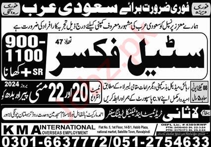 KMA International Overseas Employment Riyadh, riyadh Saudi Arabia invites applications from eligible candidates for the post of steel fixer as per advertisement of May 19, 2024 published in daily Express Newspaper. Middle etc. educational qualification will be preferred.