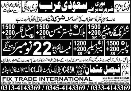 Latest Overseas jobs in Faisal Usman Trade Test & Training Center in Construction and others can be applied till 22 November 2023 or as per closing date in newspaper ad. Read complete ad online to know how to apply on latest Faisal Usman Trade Test & Training Center job opportunities. Skills in Plumbing, Carpentry and Masonry may be preferred for these Faisal Usman Trade Test & Training Center jobs. Salary varies from 132000. Extra hours work allowed to earn more. On job medical, transport and accommodation facility is provided.