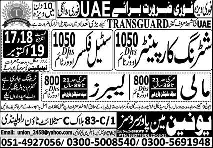 Union Manpower Services is looking for candidates for following posts as per job advertisement published in daily Express Newspaper of October 17, 2023 for location Sharjah, abu dhabi UAE: