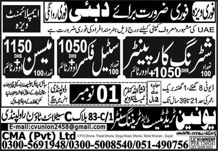 Vacant posts including mason, steel fixer and shuttering carpenter are announced in Union Trade Test and Training Center Dubai, abu dhabi Dubai as per 1 November 2022 advertisement in daily Express Newspaper. Candidates with Matric, Middle and Intermediate etc. educational background will be preferred.