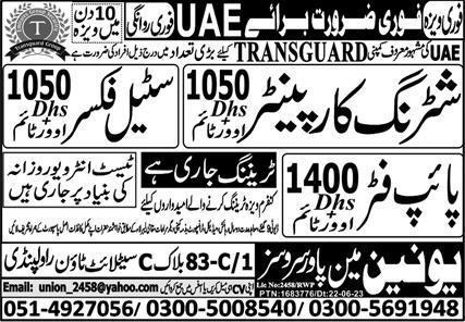 Union Manpower Services jobs advertisement dated about 18 October 2023 in daily Express Newspaper invites application for the vacant post of steel fixer, pipe fitter and shuttering carpenter in Abu Dhabi, sharjah UAE. Educational qualifications required Intermediate and Matric etc.