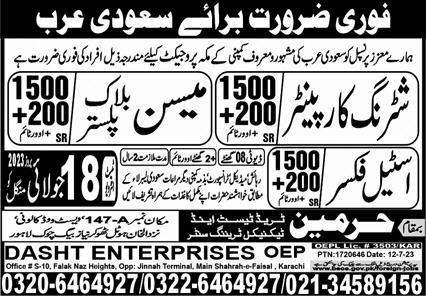Dasht Enterprises Overseas Employment Promoters jobs advertisement dated about 13 July 2023 in daily Express Newspaper invites application for the vacant post of plaster mason, steel fixer, mason, shuttering carpenter and block mason in Makkah, madina Saudi Arabia. Matric and Intermediate etc. educational qualification will be preferred.