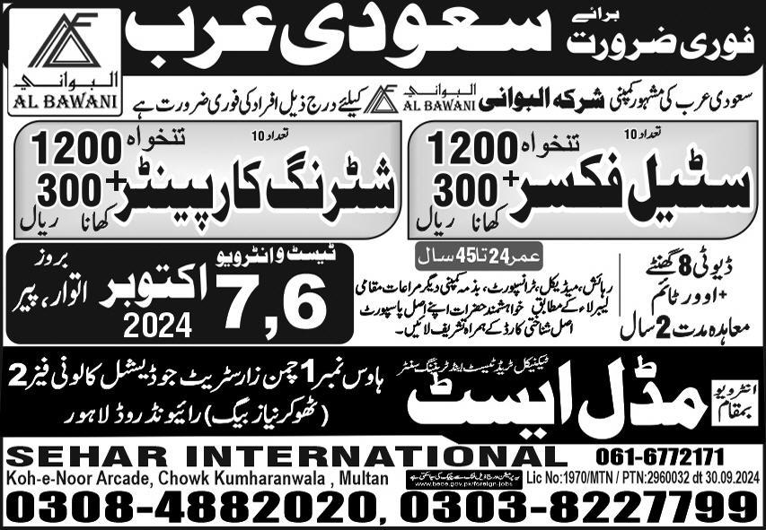 Sehar International invites applications for job positions advertised in daily Express dated 4 October 2024 for following vacancies in Riyadh, makkah Saudi Arabia.