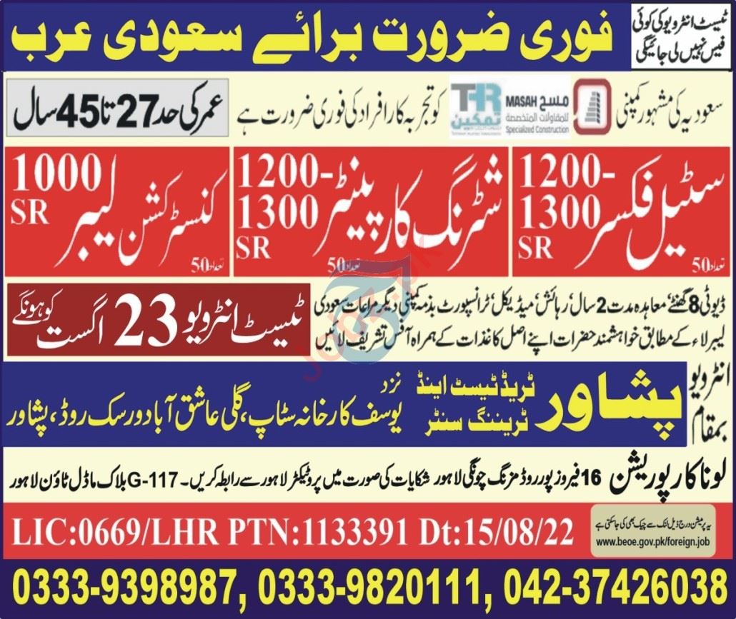 Peshawar Trade Test & Technical Training Center invites applications for job positions advertised in daily Aaj dated 21 August 2022 for following vacancies in Saudi Arabia, saudi arabia Saudi Arabia.