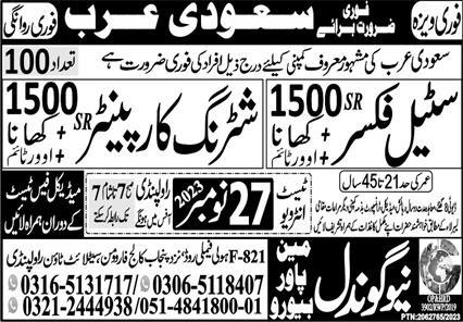 Vacant posts including steel fixer and shuttering carpenter are announced in New Gondal Manpower Bureau Saudi Arabia, saudi arabia Saudi Arabia as per 25 November 2023 advertisement in daily Express Newspaper. Candidates with DAE, Intermediate and Matric etc. educational background will be preferred.