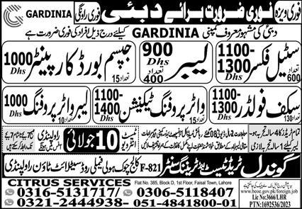 Gondal Trade Test & Training Center jobs advertisement dated about 8 July 2023 in daily Express Newspaper invites application for the vacant post of water proofing technician, labor water proofing, labor, scaffolder, gypsum board carpenter and steel fixer in Dubai, abu dhabi Dubai. Intermediate, Matric and DAE etc. educational qualification will be preferred.