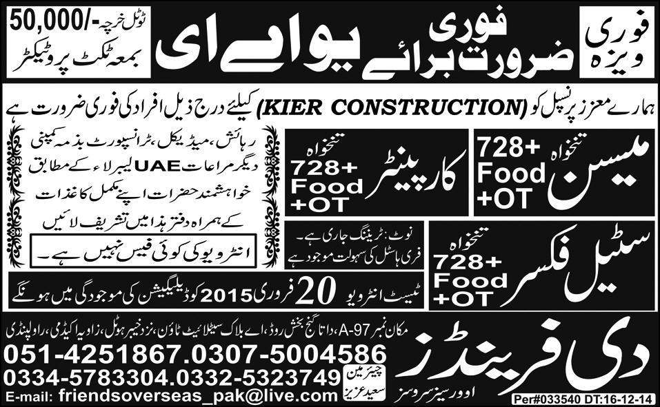 Steel Fixers, Carpenters And Mason Job Opportunity