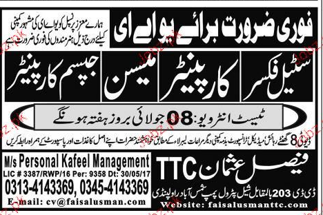 Steel Fixers, Carpenters, Mason Job Opportunity