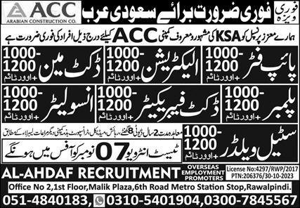 Al Ahdaf Recruitment Overseas Employment Promoters is looking for candidates for following posts as per job advertisement published in daily Express Newspaper of October 31, 2023 for location Dammam, madina Saudi Arabia: