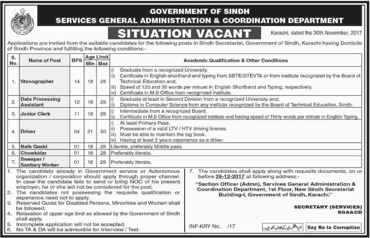 Services General Administration & Coordination Department, Government of the Sindh seeks applications from energetic, committed and motivated candidates for the posts of Stenographer, Data Processing Assistant, Junior Clerk, Driver, Naib Qasid, Watchman and Sweeper.