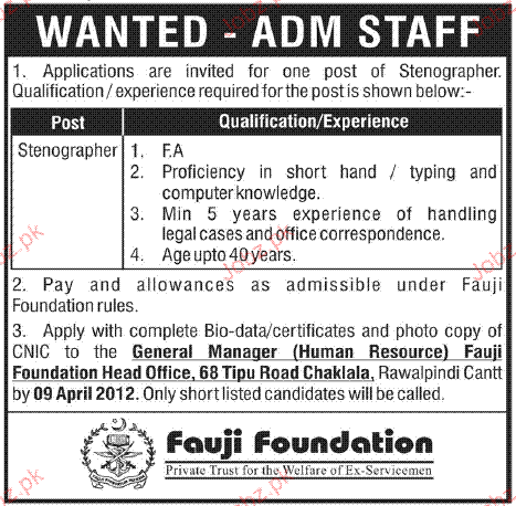 Latest Fauji Foundation Admin Clerical Posts Rawalpindi 2025