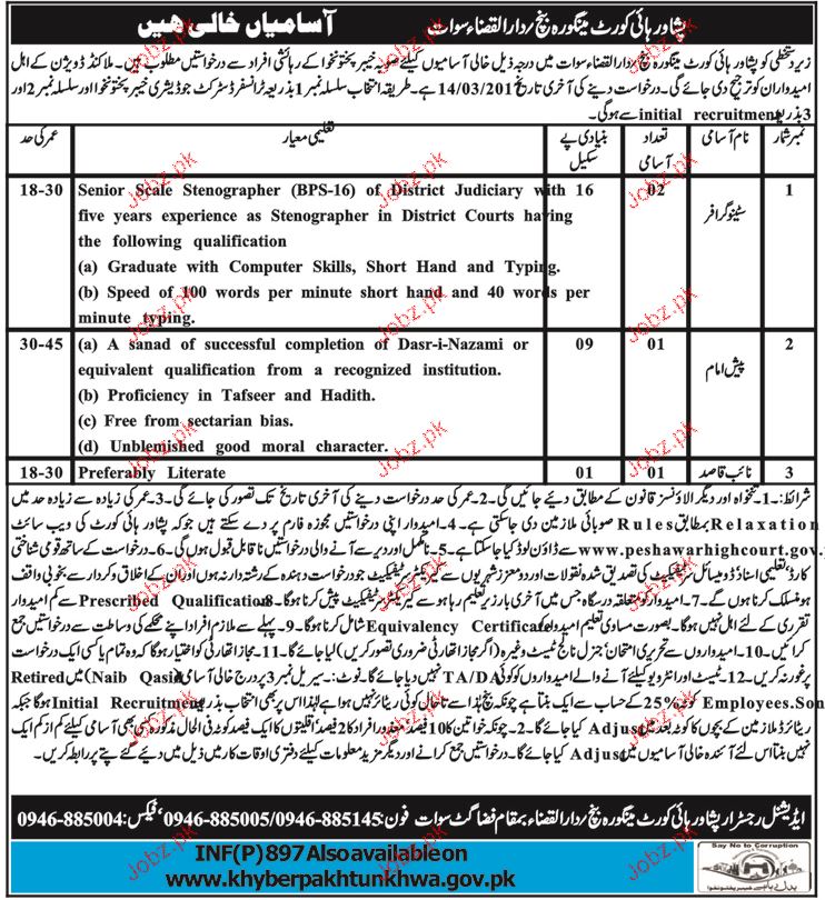Stenographers, Pesh Immam and Naib Qasid Job in High Court