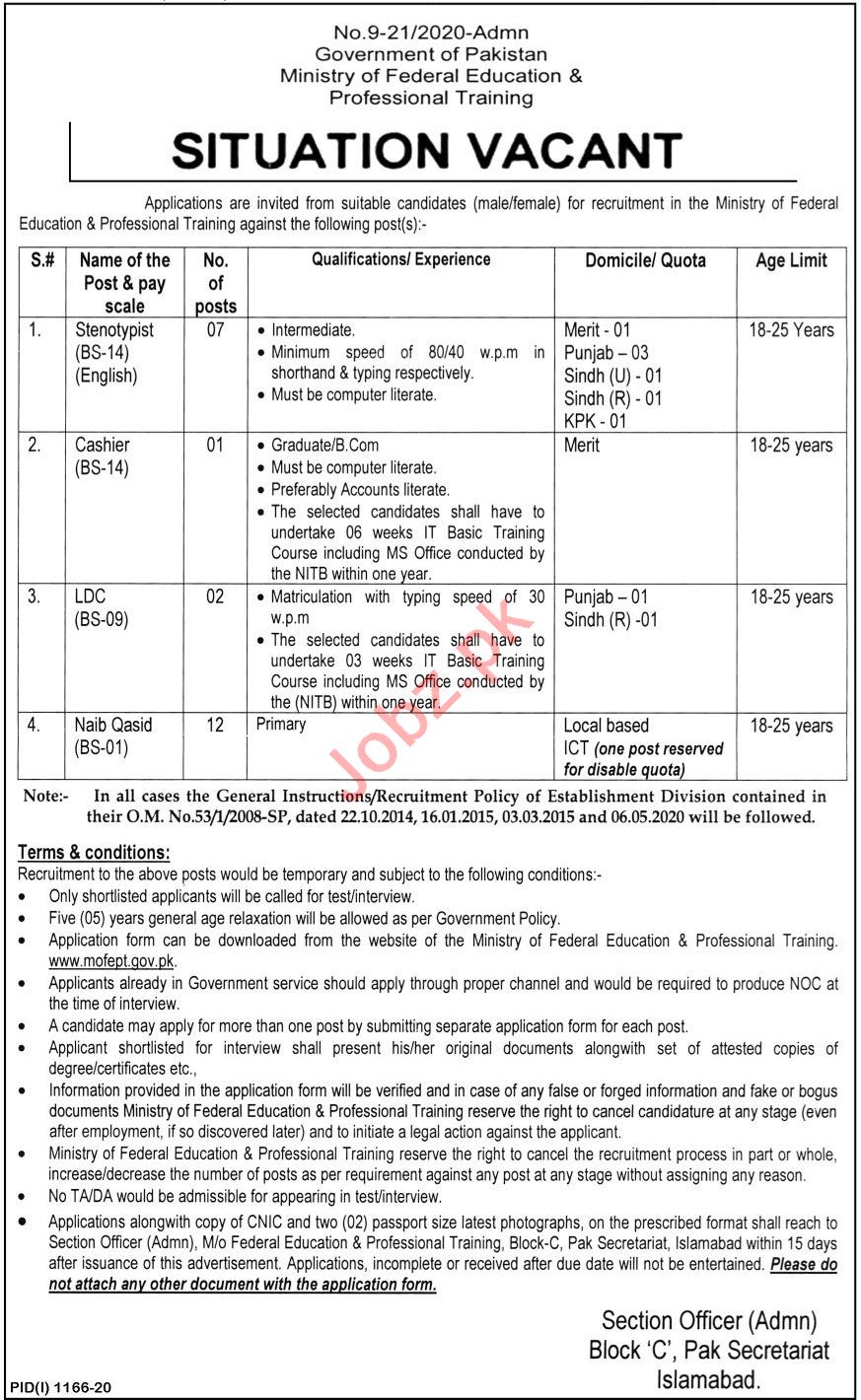 Vacancies in Ministry of Federal Education & Professional Training MOENT Advertisement September 2020