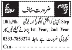 Step School jobs advertisement dated about 1 December 2022 in daily Jang Newspaper invites application for the vacant post of teacher, female teacher and english language teacher in Quetta, quetta Balochistan Pakistan. Persons with Bachelor and Master etc. education can apply.