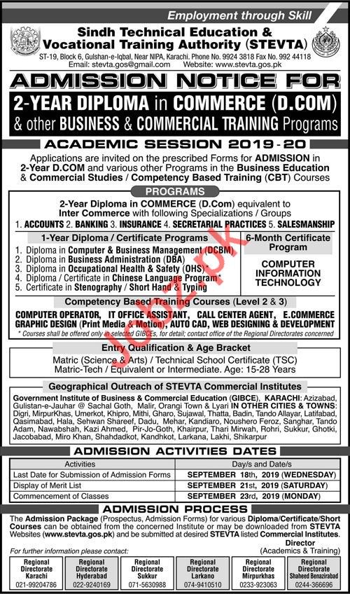 Sindh Technical Education & Vocational Training Authority has announced admissions in Diploma in Commerce, Diploma in Computer & Business Management, Diploma in Business Administration DBA, Diploma in Occupation Heath & Safety, Diploma in Chinese Language Program, Certificate in Stenography, Short Hand, Typing in Karachi, Hyderabad, Sukkur, Larkana, Mirpurkhas, Shaheed Benazirabad. Read newspaper ad for exact details.