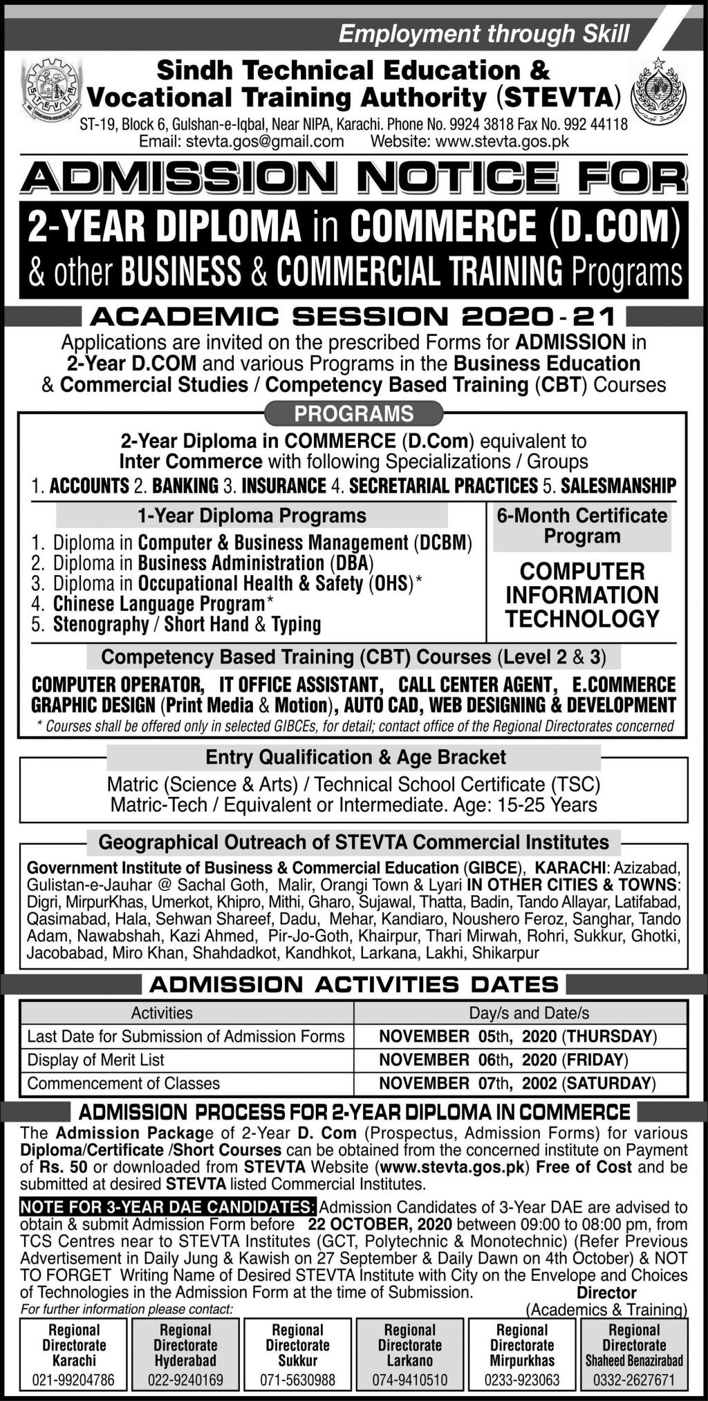 Sindh Technical Education and Vocational Training Authority STEVTA is offering admissions for diploma in Computer & Business Management, Business Administration, Occupational Health & Safety etc. Read newspaper ad for exact details.