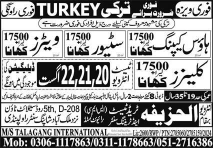 Al Huzaifa Trade Test & Training Centre Istanbul, ankara Turkey invites applications from eligible candidates for the post of waiter, steward, house keeping staff and cleaner as per advertisement of August 17, 2024 published in daily Express Newspaper. Persons with Intermediate and Matric etc. education can apply.