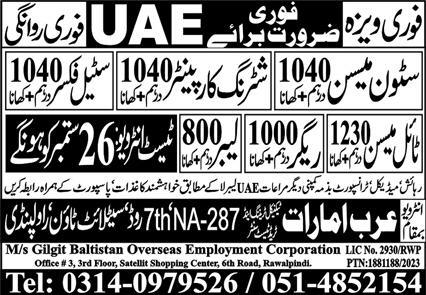 Gilgit Baltistan Overseas Employment Corporation jobs advertisement dated about 21 September 2023 in daily Express Newspaper invites application for the vacant post of tile mason, labor, stone mason, shuttering carpenter, steel fixer and rigger in Abu Dhabi, abu dhabi UAE. Persons with Middle etc. education can apply.