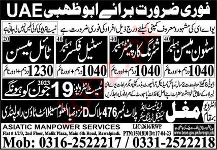 Mughal Trade Test & Technical Training Center invites applications for job positions advertised in daily Express dated 18 June 2023 for following vacancies in Abu Dhabi, dubai UAE.