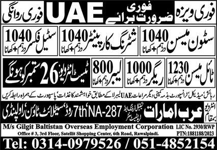 Arab Emirates Technical Training & Trade Test Center jobs advertisement dated about 21 September 2023 in daily Express Newspaper invites application for the vacant post of stone mason, steel fixer, tile mason, rigger, labor and shuttering carpenter in Abu Dhabi, sharjah UAE. Preferred Education is Intermediate and Matric etc.