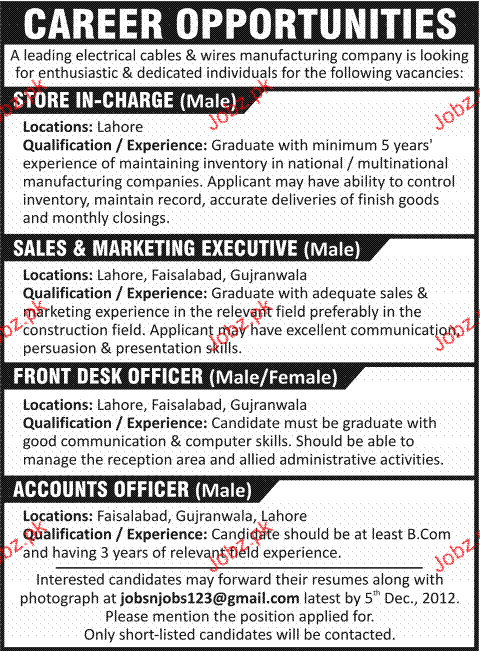 Apply as per details in job advertisement. Login to view further details of how to apply via https://www.jobz.pk online.