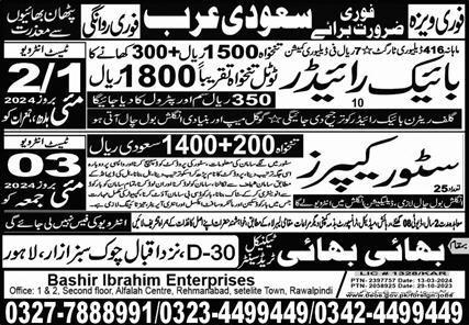 Vacant posts including bike rider, store keeper and rider are announced in Bhai Bhai Technical Trade Test Center Dammam, taif Saudi Arabia as per 1 May 2024 advertisement in daily Express Newspaper. Persons with Intermediate and Matric etc. education can apply.