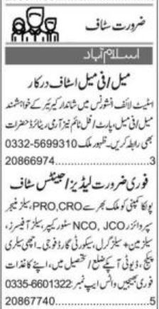 Vacant posts including sales girl, salesman, security guard, sales officer, sales manager, jco, sales supervisor, cro, insurance agent, customer relation officer, public relation officer and store keeper are announced in Private Company Islamabad, rawalpindi Islamabad Pakistan as per 24 August 2022 advertisement in daily Express Newspaper. Educational qualifications required Middle, Intermediate, Bachelor and Matric etc.