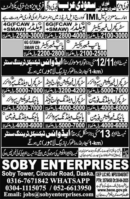 Soby Enterprises Overseas Employment Promoters Riyadh, riyadh Saudi Arabia invites applications from eligible candidates for the post of pipe fabricator, structural welding supervisor, structural fabricator, structural fabrication supervisor, structural fabrication charge hand, piping fabrication supervisor, piping welding foreman, structural welding foreman, piping fabrication foreman, piping welding supervisor, structural welding charge hand and welder as per advertisement of May 4, 2025 published in daily Express Newspaper. Matric, Middle and Intermediate etc. educational qualification will be preferred.