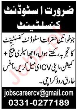 Private Company Karachi, karachi Sindh Pakistan invites applications from eligible candidates for the post of student consultant as per advertisement of August 17, 2025 published in daily Jang Newspaper. Master and Bachelor etc. educational qualification will be preferred.