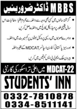 Students Inn Academy of Science MBBS admissions 2022 has been announced. Eligible students who qualify as per admission criteria in Students Inn Academy of Science Lahore Punjab Pakistan can apply in Medical Medical College for academic year 2022. Eligible students for fulfilling criteria for admissions in MBBS can enroll as per Private admission policy 2022 till closing date 24 August 2022. Read newspaper ad for exact details.