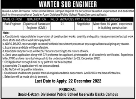 Sub Engineer Jobs in Quaid e Azam Divisional Public School