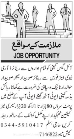 Oil & Gas Company jobs advertisement dated about 6 June 2024 in daily Jang Newspaper invites application for the vacant post of sepoy, subedar major, naik, subedar, havaldar and security guard in Karachi, karachi Sindh Pakistan. Matric, Intermediate and Middle etc. educational qualification will be preferred.