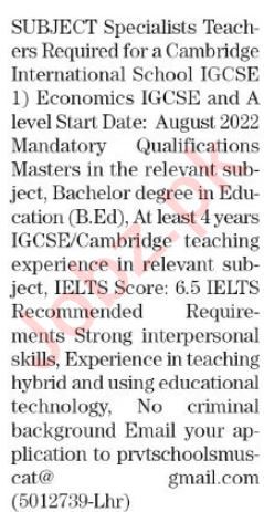 IB IGCSE COACHING Schools is looking for candidates for following posts as per job advertisement published in daily The News Newspaper of August 13, 2022 for location Rawalpindi, islamabad Punjab Pakistan: