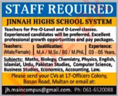 Jinnah Highs School System is looking for candidates for following posts as per job advertisement published in daily Nawaiwaqt Newspaper of July 21, 2024 for location Multan, multan Punjab Pakistan: