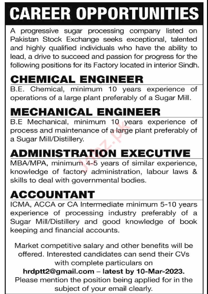 Sugar Mill invites applications for job positions advertised in daily Dawn dated 27 February 2023 for following vacancies in Karachi, karachi Sindh Pakistan.