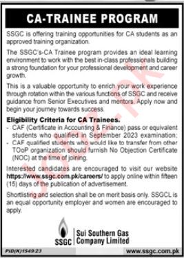 Vacant posts including ca trainee program are announced in Sui Southern Gas Company Islamabad, islamabad Islamabad Pakistan as per 26 November 2023 advertisement in daily Jang Newspaper. CA etc. educational qualification will be preferred.