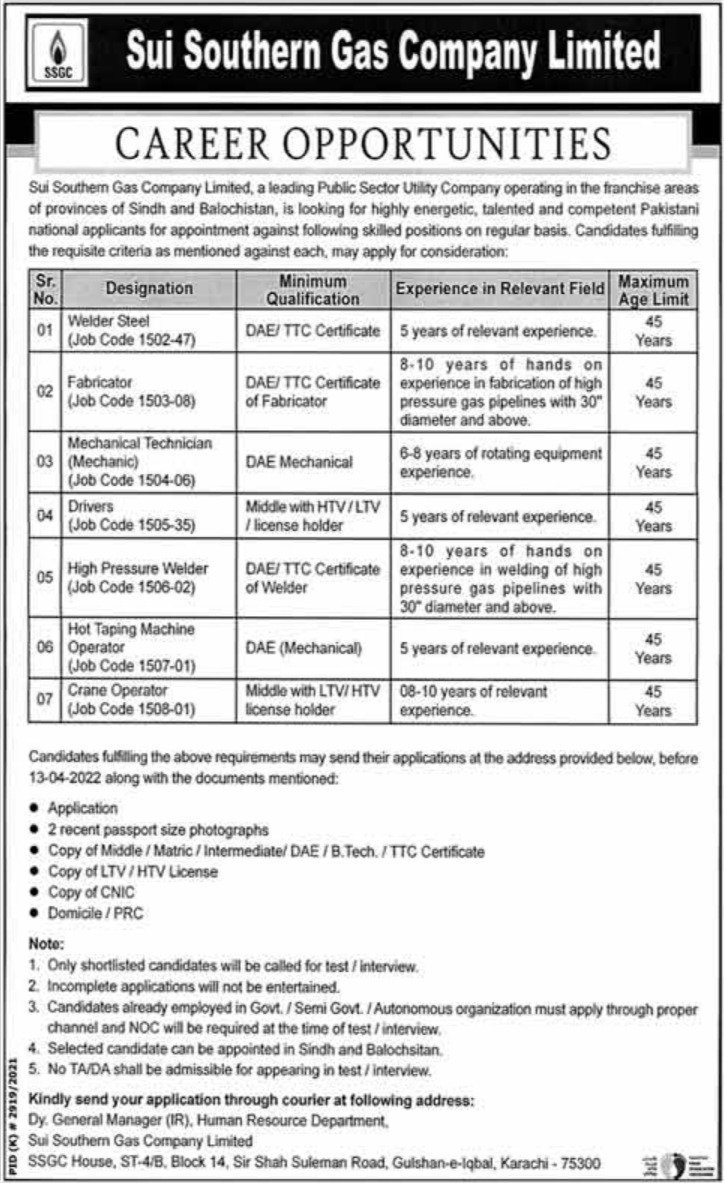 Vacant posts including fabricator, crane operator, welder steel, mechanical technician, high pressure welder, mechanic, hot taping machine operator and driver are announced in Sui Southern Gas Company Limited SSGC Karachi, karachi Sindh Pakistan as per 3 April 2022 advertisement in daily Dunya Newspaper. Bachelor, Middle, DAE, Matric and Intermediate etc. educational qualification will be preferred.