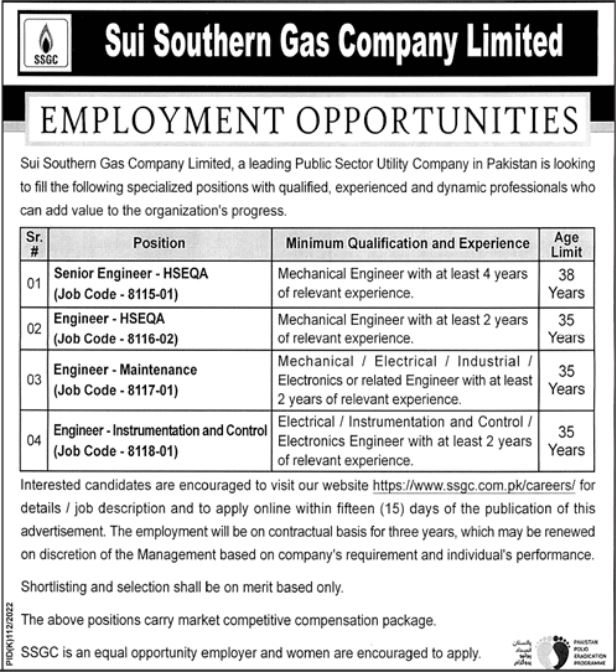 Sui Southern Gas Company Limited SSGC Karachi, karachi Sindh Pakistan invites applications from eligible candidates for the post of engineer hseqa, engineer maintenance, engineer instrumentation control and engineer as per advertisement of July 17, 2022 published in daily Jang Newspaper. B.E, Bachelor and DAE etc. educational qualification will be preferred.