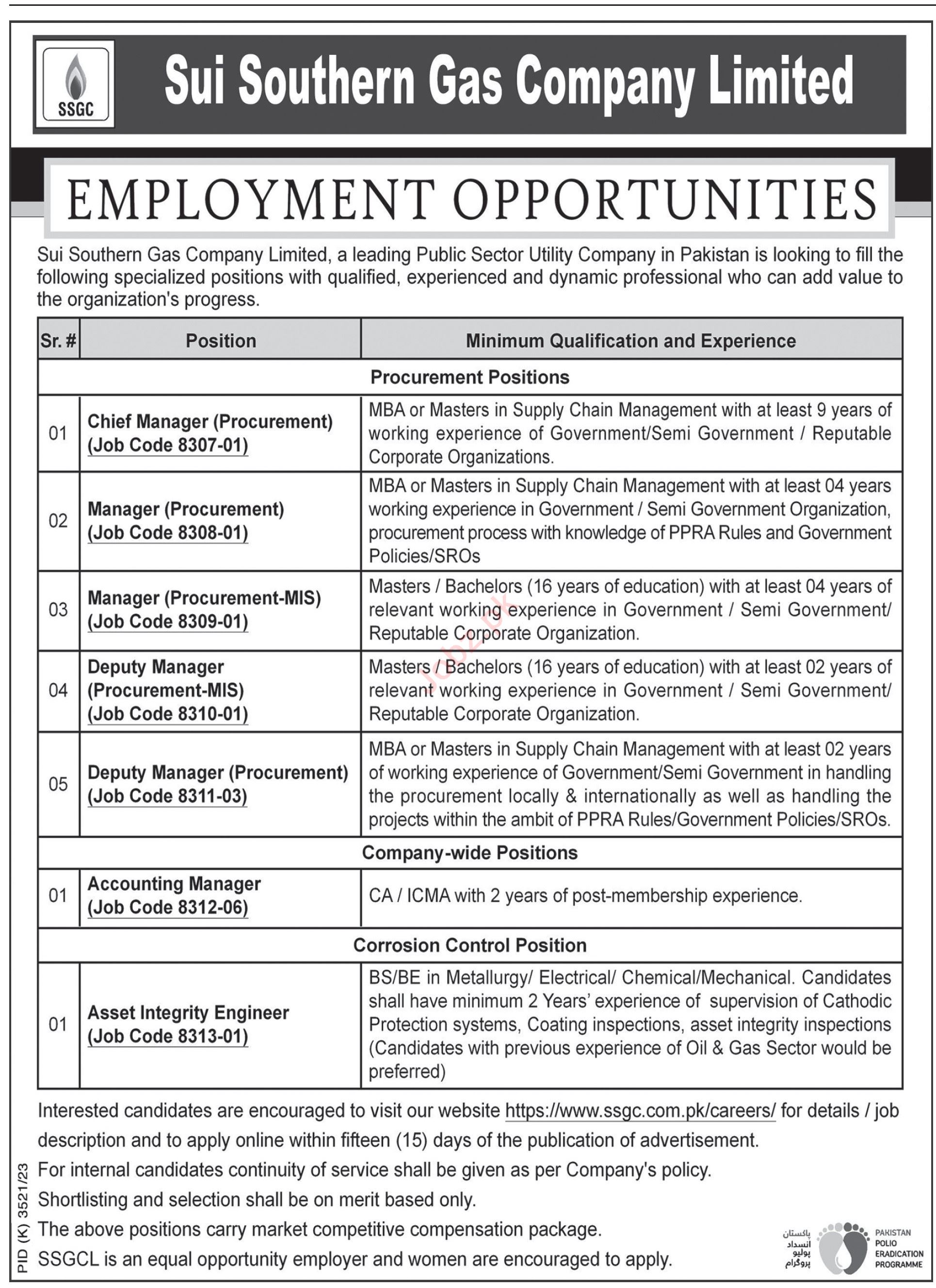 Sui Southern Gas Company Limited SSGC jobs advertisement dated about 9 June 2024 in daily Express Tribune Newspaper invites application for the vacant post of manager procurement, deputy manager procurement, manager procurement mis, deputy manager, asset integrity engineer, chief manager and accounting manager in Karachi, karachi Sindh Pakistan. B.E, Master, Bachelor and MBA etc. educational qualification will be preferred.