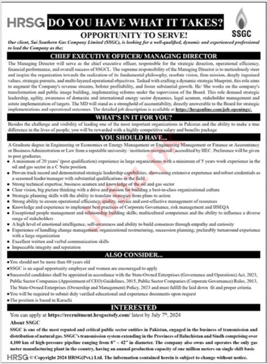 Sui Southern Gas Company Limited SSGC Karachi, karachi Sindh Pakistan invites applications from eligible candidates for the post of chief executive officer and managing director as per advertisement of June 23, 2024 published in daily Jang Newspaper. Preferred Education is Mphil, Phd and Master etc.