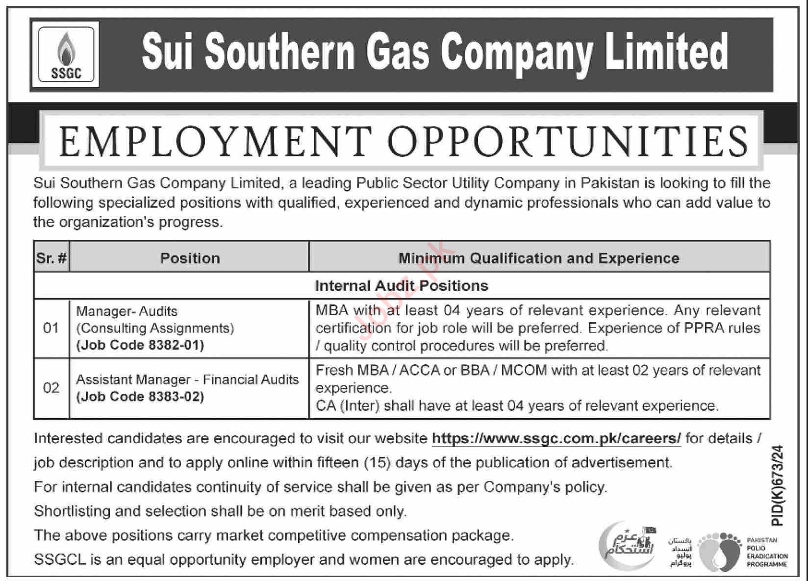 Sui Southern Gas Company Limited SSGC Karachi, karachi Sindh Pakistan invites applications from eligible candidates for the post of assistant manager financial audit and manager audit as per advertisement of September 8, 2024 published in daily Dawn Newspaper. Candidates with Bachelor and Master etc. educational background will be preferred.