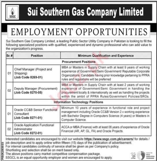 Sui Southern Gas Company Limited SSGC jobs advertisement dated about 7 April 2024 in daily Jang Newspaper invites application for the vacant post of Oracle Ccb Functional Consultant, Chief Manager, Oracle Application Functional Administrator and Deputy Manager Procurement in Karachi, karachi Sindh Pakistan. Master, Bachelor, MS, MBA and ACCA etc. educational qualification will be preferred.